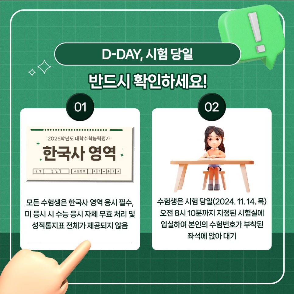 ✅ 1교시를 선택하지 않은 수험생의 경우에도 8시 10분까지 지정된 시험실에 입실