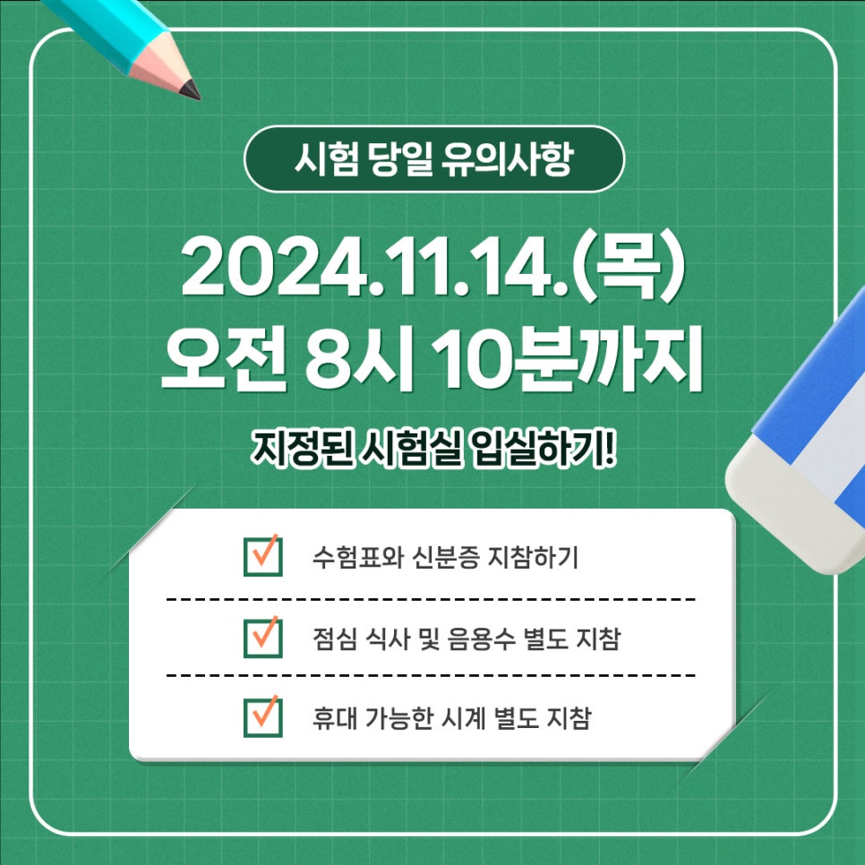 - 샤프와 연필, 지우개: 메모나 계산 시 필요합니다. 단, 답안지는 반드시!! 컴퓨터용 사인펜으로 작성해야 하며, 수정 테이프나 볼펜은 금지됩니다.