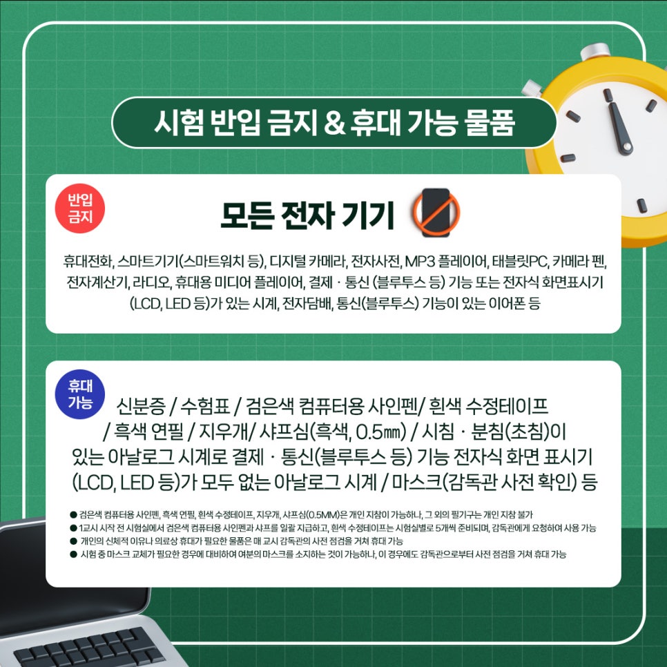 - 시계: 시침과 분침만 있는 아날로그 시계를 허용하며, 스마트 워치 등 디지털 시계는 반입이 금지됩니다.